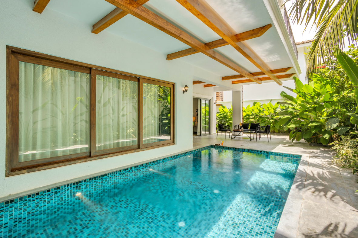 ShareWelcome to Villaggio Una V1, a charming 4-bedroom luxury villa in Siolim. The bright foyer dazzles with high ceilings, large windows, and lush black planters with vibrant mosaics. Upstairs, a cozy green armchair and ottoman await on the landing, framed by arched windows showcasing tropical views. This delightful retreat blends elegance and nature for a perfect getaway.