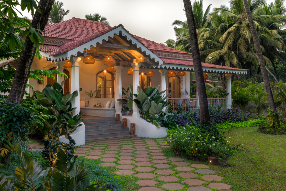 ShareAmger is a 130-year-old restored Goan-Portuguese Villa situated in Parra, North Goa. The 5,500 sq. ft. luxury villa, which is available for rent, sits on half-an-acre of land, offering a private pool and lush, tropical landscapes overlooking paddy fields. It features grand architecture, including arched windows and doors, Juliet balconies, and an original Mangalore tile-and-wood roof.