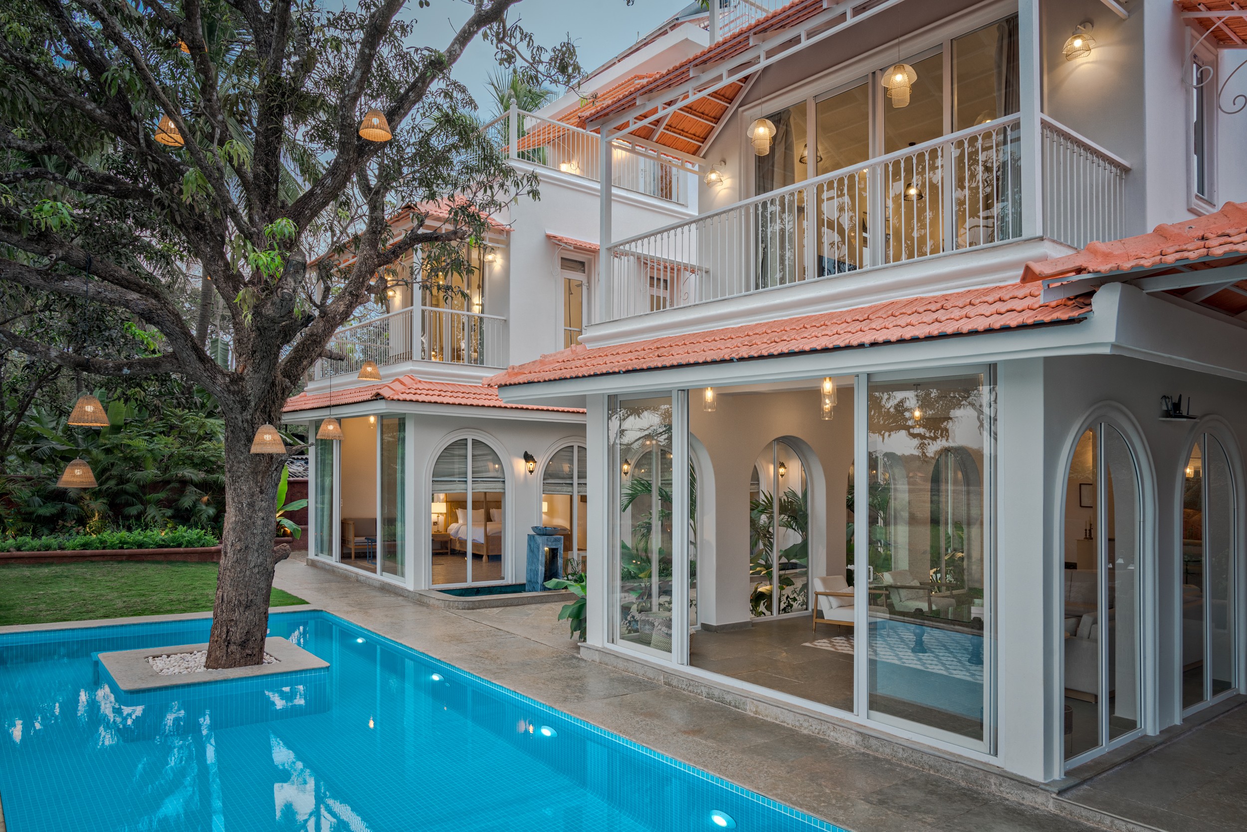 ShareA love letter to Goa, Villa Amore should be your next pick for that much-needed vacation you have been longing for. Hidden away in the lush bylanes of Assagao the villa exudes luxury and finesse in terms of the interiors of the house. Villa Amore’s amenities include a one-of a kind private pool that allows a magnificent old tree to literally emerge from the middle of it. Clean and elegant, the colour palette of the house is immersed in whites, orange, cream, blues and green. Amore is a tasteful combination of contemporary interiors furnished with modern furniture and some eclectic wallpapers. The kitchen is light and airy that follows a pistachio colour scheme. The bathrooms are a sight for sore eyes that provided a pop of colour with blue and green hues. The tiling around the house is exquisite and faultless. Step out onto the patio for views of unmarred greens and escape the world, even for a few days with the peace and beauty that surrounds you.