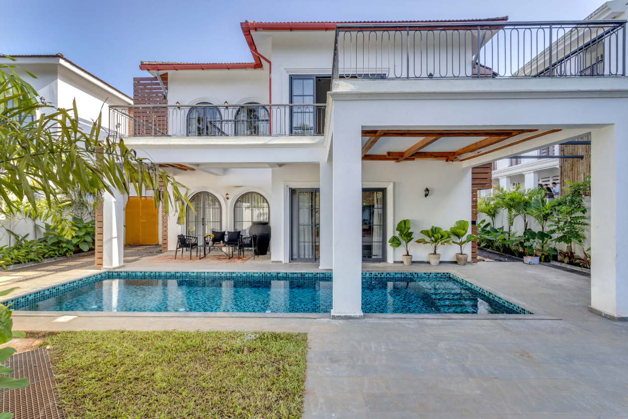 Welcome to Villaggio Una V3, a charming 4-bedroom luxury villa in Siolim. The bright foyer dazzles with high ceilings, large windows, and lush black planters with vibrant mosaics. Upstairs, a cozy green armchair and ottoman await on the landing, framed by arched windows showcasing tropical views. This delightful retreat blends elegance and nature for a perfect getaway.